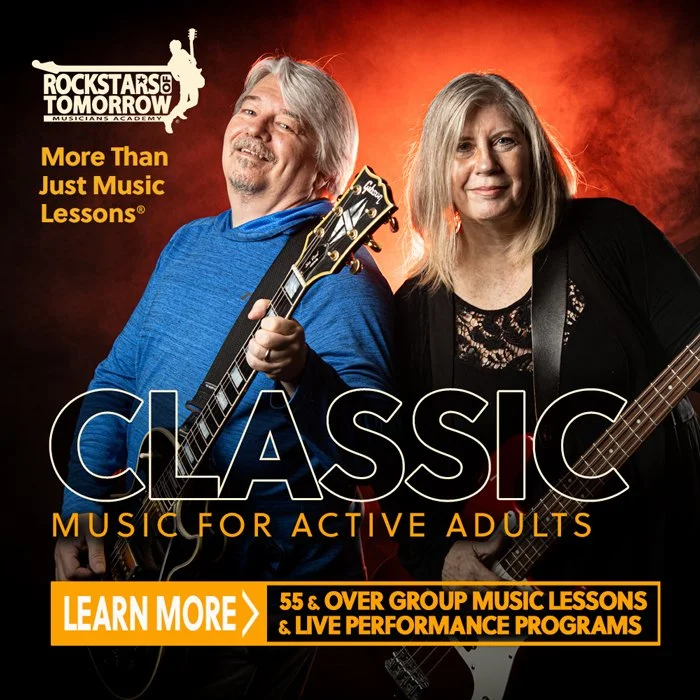 At Rockstars of Tomorrow, we are proud to offer a vibrant and engaging music lesson and live performance program tailored specifically for active adults aged 55 and over.